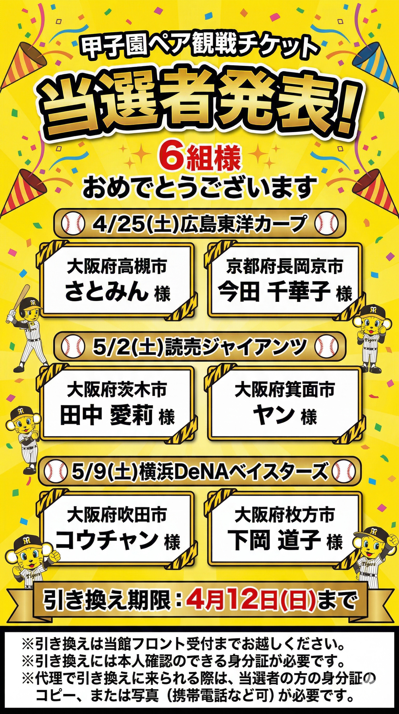 - 第三弾【甲子園ペア観戦チケット】当選者発表!引き換えは、4/12までに当館フロントへ